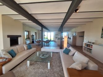 Das Obergeschoss unterteilt sich mit ca. 200 m2 Nettofläche in ein großzügiges Wohnzimmer mit moderner offener Küche und Essplatz, angrenzender großer Obergeschossterrasse in Panoramalage, zwei Schlafzimmer und das große Badezimmer.